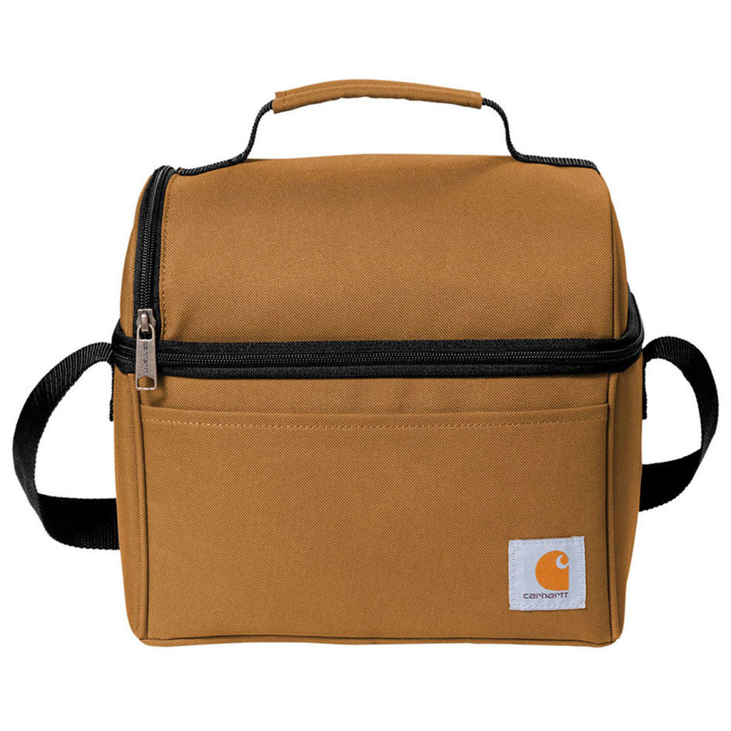 Add a company logo to the Carhartt Carhartt Brown Lunch 6-Can Cooler to make keeping drinks and snacks cool a breeze on the construction site or as you head out to adventure. The 600D polyester is up for whatever the day holds with a fully insulated main compartment with seam-sealed design to keep melting ice from leaking and a top compartment to keep food from being crushed. The large main compartment can hold up to 6 12-ounce cans and a front slash pocket it great for quick snacks. A shoulder strap and top handle make carrying a breeze. Perfect as employee gifts or to resale with a custom logo.