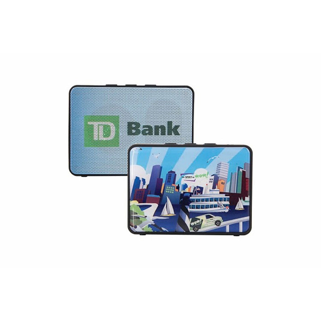 Let your message be heard loud and clear by customizing this Origaudio Black Boxanne Bluetooth Speaker with a brand name or logo and giving it away as a gift! Take the party with you wherever you roam thanks to its powerful built-in subwoofer. Dual-sided customization on this speaker gives your brand maximum visibility and leaves a lasting impression.