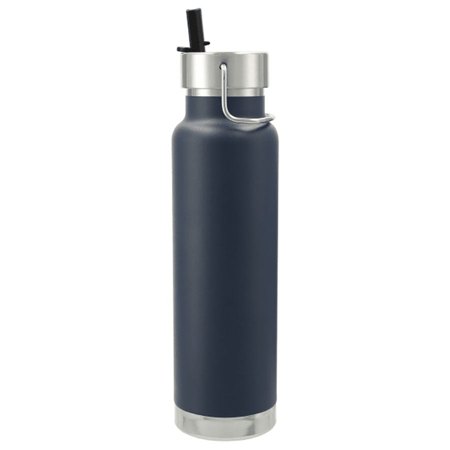Enhance your product offerings with the 48-Hour Leed's Navy Thor Copper Vacuum Insulated Bottle 25oz Straw Lid. Designed with a durable double-wall stainless steel vacuum construction and copper insulation, this bottle keeps beverages cold for up to 48 hours and hot for at least 12 hours. The sleek design also prevents condensation on the outside, ensuring a comfortable grip.