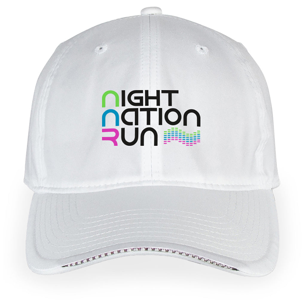 Design a colorful custom logo for the Merrimack Hat Co. White Neo Recycled Performance Cap. This cap is made of recycled materials for an eco-friendly version of a favorite design. The unisex cap has a UPF rating of 50 and reflective piping, making it perfect for outdoor adventures, sporting events, or just hanging out with friends.