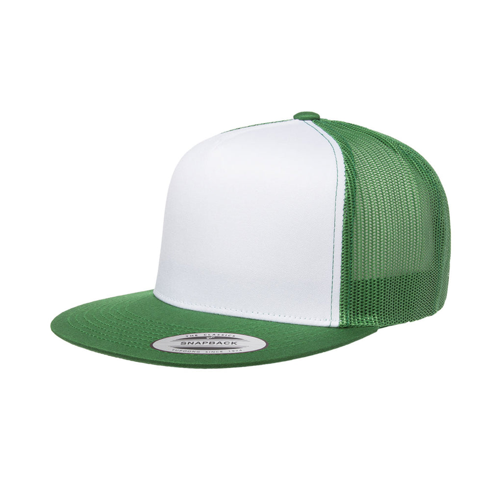 Keep on trucking with stunningly attractive corporate apparel by ordering the company logoed Yupoong Kelly/White Classic Trucker with White Front Panel Cap. The cotton and polyester blended fabric resists rips and tears to give you years of on the road use. Trucker mesh back hard buckram circulates air to keep the head cool throughout the day. Attach a custom logo on the imprint area to let everyone know your company offers the best products and services. The four-inch raised crown presents you in the best way possible. Snap the plastic closure to fit your head snugly.Highlights