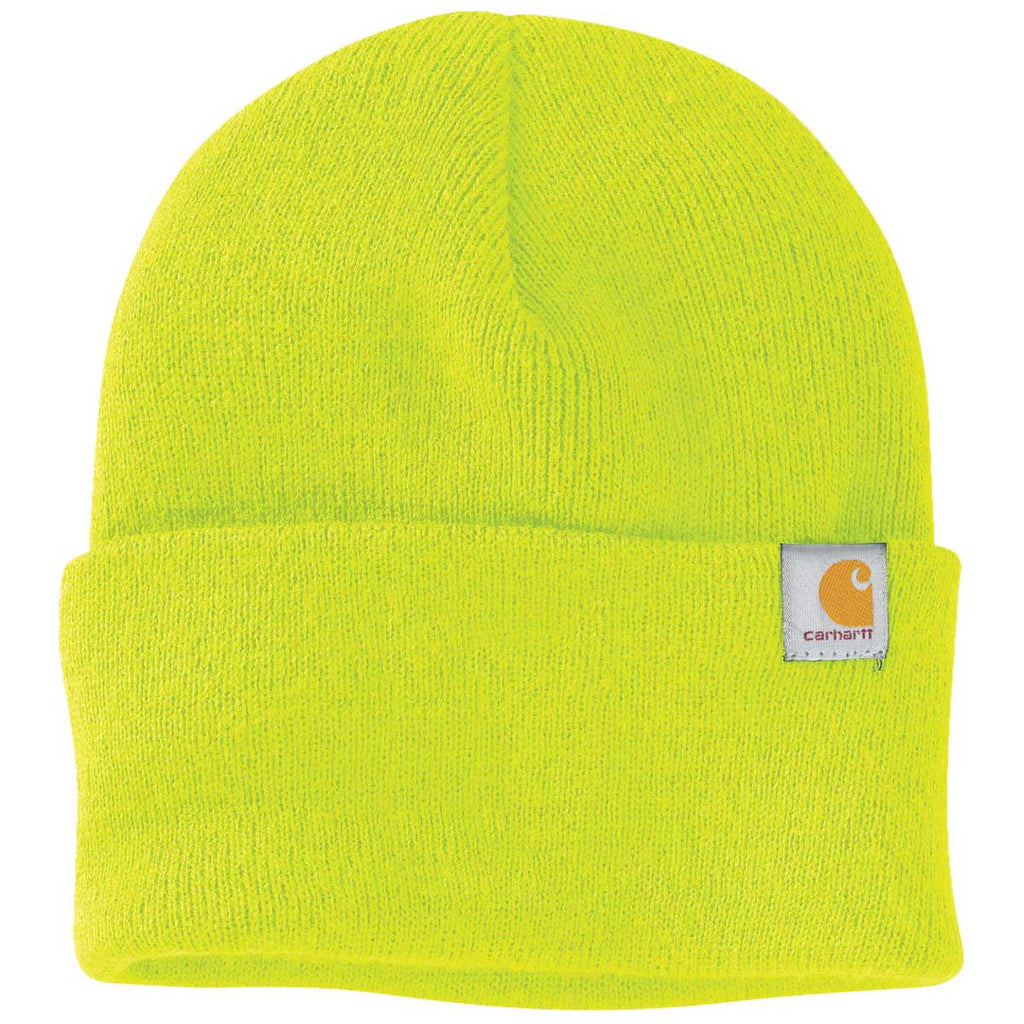 Add an embroidery logo to the custom Carhartt Bright Lime Watch Cap 2.0 for a look that will keep you warm and protected whether building a house or simply enjoying the great outdoors. The industrial-style stretchy rib knit cap is soft to the touch, but durable with a stay-put fit. Add a custom logo to use as an employee gift for those working in colder climates. This cap has a Carhartt label stitched on to demonstrate quality. The one-size-fits-most design is great for those who love the look and style of a branded beanie that is a bit heavier duty. Great for hunters, fishermen, and other outdoorsmen.