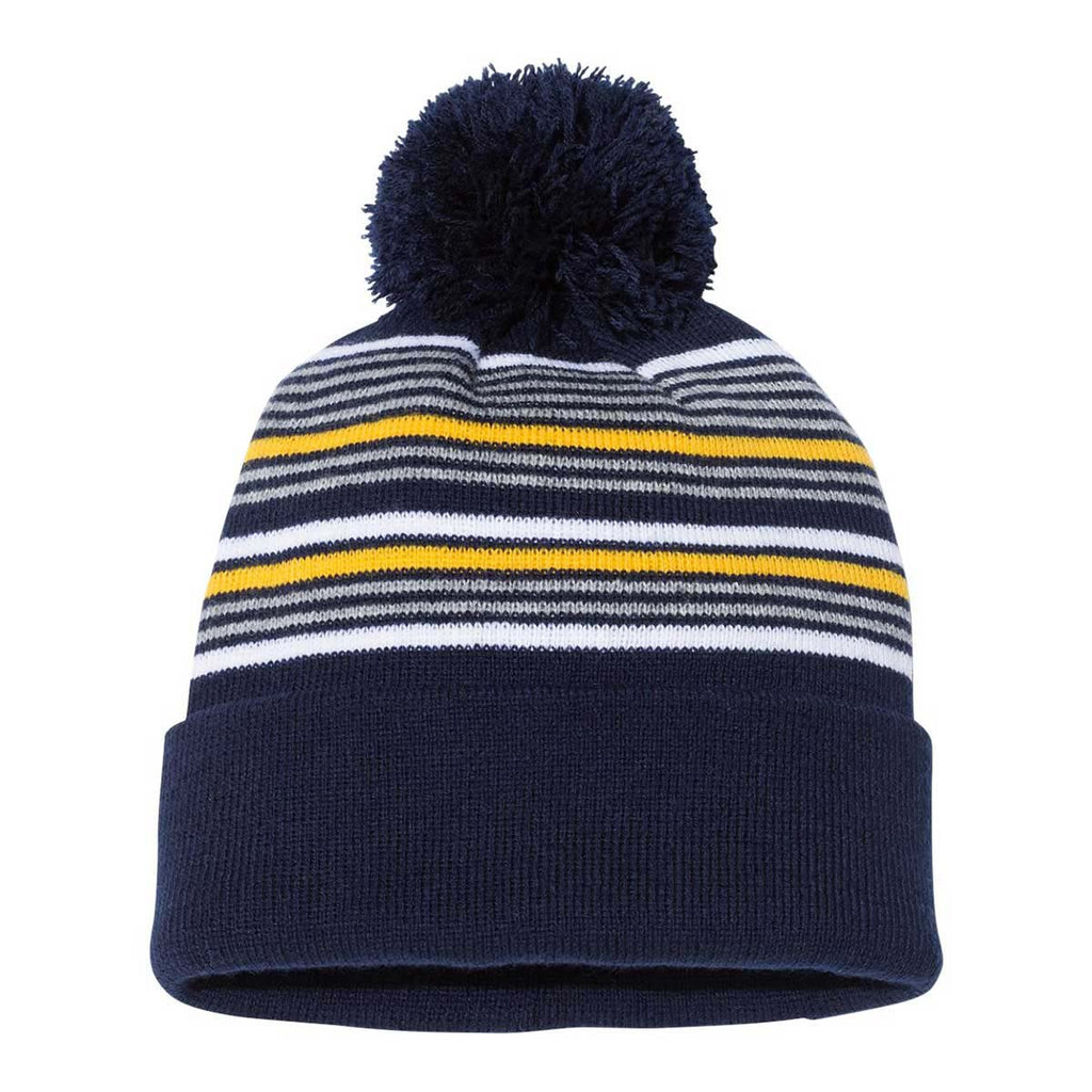 Sportsman Navy/White/Grey/Gold 12" Striped Pom-Pom Knit Cap