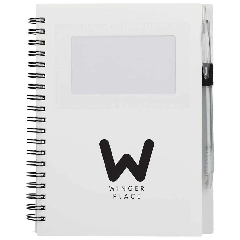 Great for tradeshows, meetings, and other industry events, the Bullet White Recycled Star Spiral Notebook with Pen will show off your logo while also providing your team everything they need to stay organized. This customizable notebook features a blue ink pen with integrated loop and a front pocket for storing business cards.