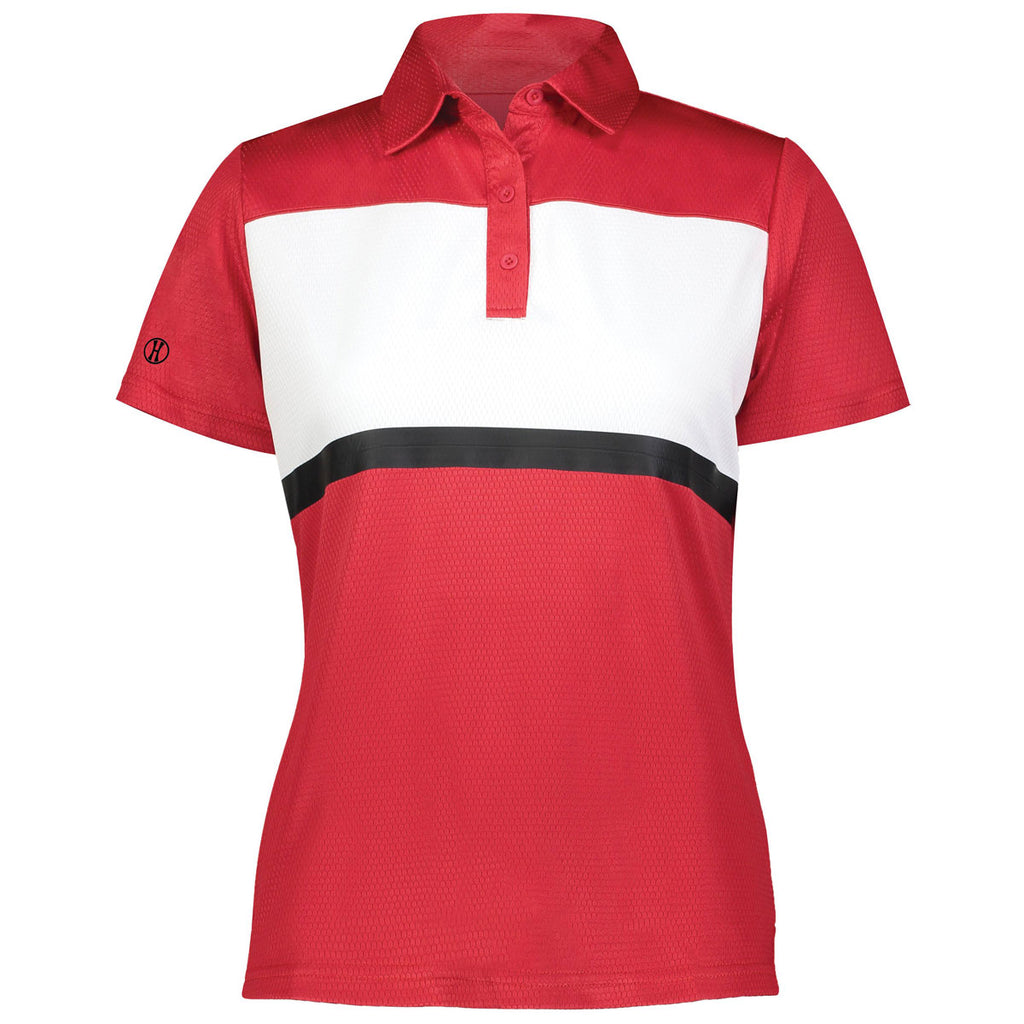Holloway Women's Scarlet/White Prism Bold Polo with embroidery is a great look as part of uniforms or employee apparel with your company logo. The lightweight polyester wicking honeycomb knit provides a feminine fit with UPF 50+ for added protection. The accents at the chest helps this polo stand out in a crowd and get you noticed. Try out a custom logo to add this polo to your logoed apparel options and watch as they become a popular sales item. The feminine fit with self-fabric collar, three-button placket, and set-in sleeves is a great addition to every wardrobe. Place an order today.Corresponding Men's Style:Holloway Men's Scarlet/White Prism Bold Polo