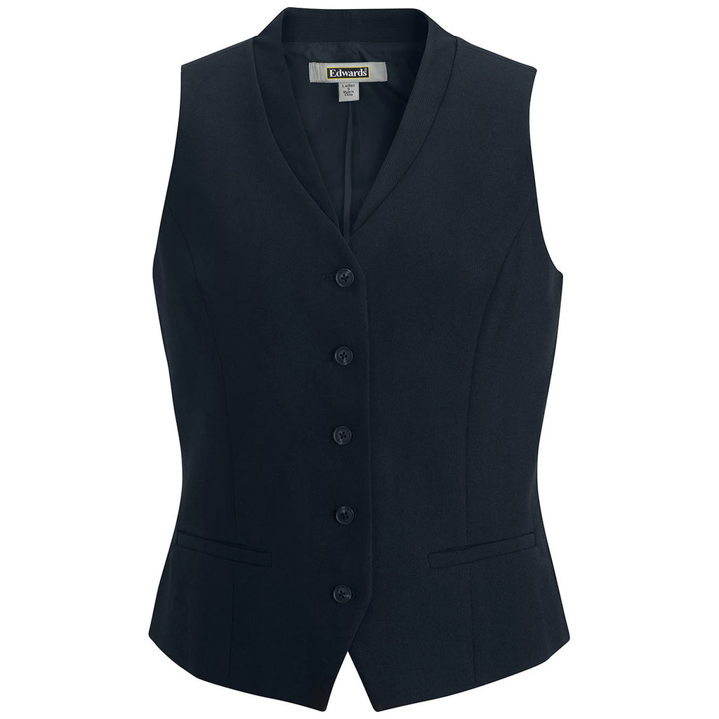Choose a custom logo for the Edwards Women's Dark Navy Ottoman Trim Vest to complete a uniform for a company, school, or organization. The polyester vest with contrast ottoman texture has a 5-button closure and traditional fit. Add a custom design to show affiliation with an organization or cause in a fun and fabulous way that can be enjoyed throughout the day. Place an order right away.Corresponding Men's Style: Edwards Men's Dark Navy Ottoman Trim Vest