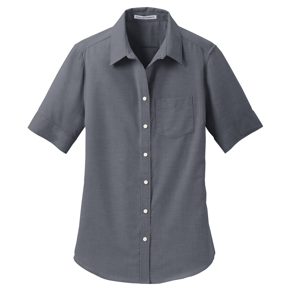 Dress shirts should be three things: stylish, comfortable, and professional. The Port Authority Women's Black Short Sleeve SuperPro Oxford Shirt fits all three. In fact, you'll find that these goals very much line up with your corporate goals, which is why this shirt is perfect for matching a sense of style with your individual brand. Create your business apparel by using our embroidery process to affix your logo to this shirt.Corresponding Men's Style: Port Authority Men's Black Short Sleeve SuperPro Oxford Shirt