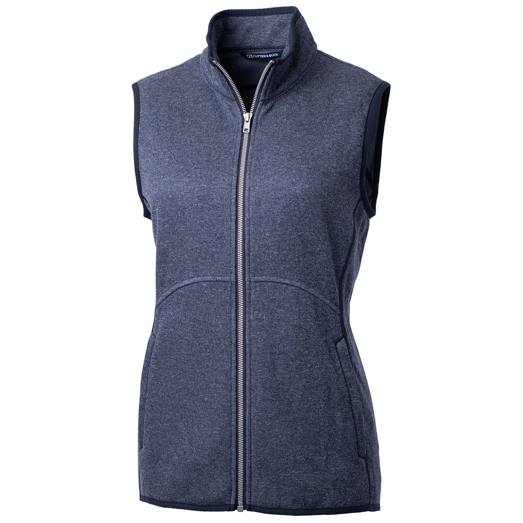 Choose a custom logo for the Cutter & Buck Women's Liberty Navy Heather Mainsail Sweater Knit Full Zip Vest. This sleek vest is not only fun but functional with built-in side pockets for necessary items and a full zip front for easy wear. Great for hiking, biking, and everyday enjoyment, no matter what is on your schedule. Order today.Corresponding Men's Style: Cutter & Buck Men's Liberty Navy Heather Mainsail Vest