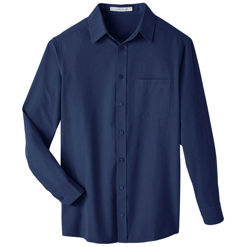 Look and feel great in a custom UltraClub Men's Navy Bradley Performance Woven Shirt made of a polyester rich woven spandex. Perfect as corporate apparel, this button up has pearlized buttons to match the overall shirt color and a spread collar for the professional look you need and deserve. Add a company logo to use as employee apparel or uniforms in high end settings where appearance is key. Adjustable cuffs and stretch performance offers a custom, active fit and easy care means daily wear is not an issue. Complete with a left chest pocket, this is a must have garment.Corresponding Women's Style: UltraClub Women's Navy Bradley Performance Woven Shirt