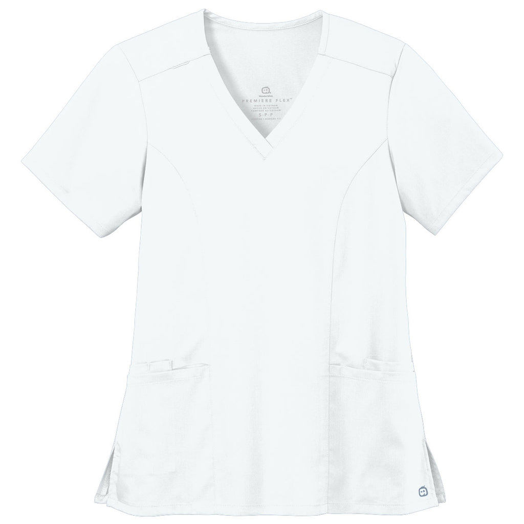 The embroidery WonderWink Women's White Premiere Flex V-Neck Top offers a comfortable style perfect for wearing all day long. When you add your brand logo to this top, you have the ideal new employee welcome gift to hand out to all team members to wear during their daily shifts.