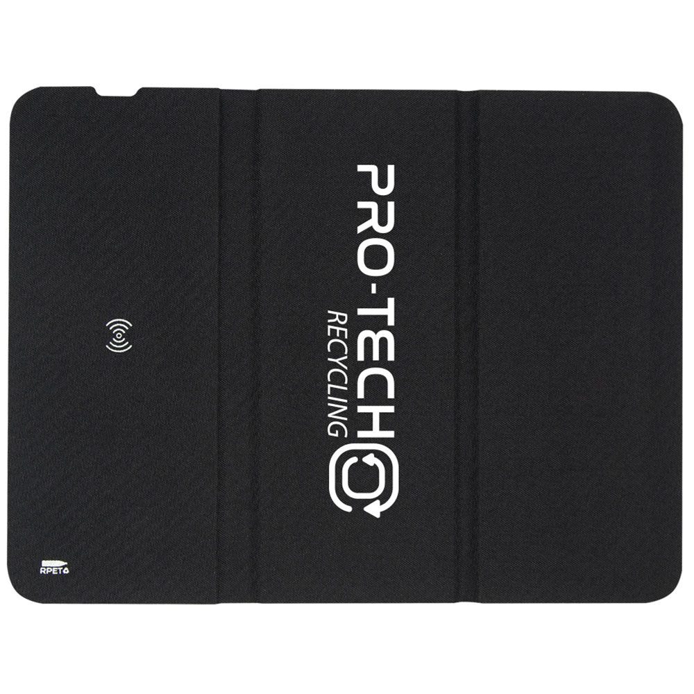 The custom Hit Black RPET 10W Wireless Charging Mouse Pad allows you to charge while you work. Created from post-consumer recycled materials to create an eco-friendly option, this Qi charger can be folded to be used while traveling or for storage. The best part is the charging pad can be used as a phone stand. Perfect for those who work on the road.