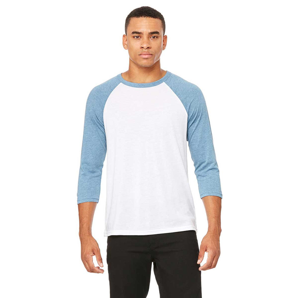 For your company softball team, order the Bella + Canvas Unisex White/Denim 3/4 Sleeve Baseball T-Shirt. The unisex sizing makes this t-shirt the one-stop fashion statement for savvy shoppers. Designed with 52% cotton and 48% polyester, this t-shirt does a great job of wicking perspiration from the skin to keep you cool during the most intense moments of a game. Contrast raglan sleeves and neck trim make the baseball t-shirt an aesthetically appealing part of your recreational wardrobe. Some versions of the t-shirt contain rayon, which bolsters the performance of the t-shirt for more arduous physical activities. Add a creatively designed company logo on the large imprint area.Highlights