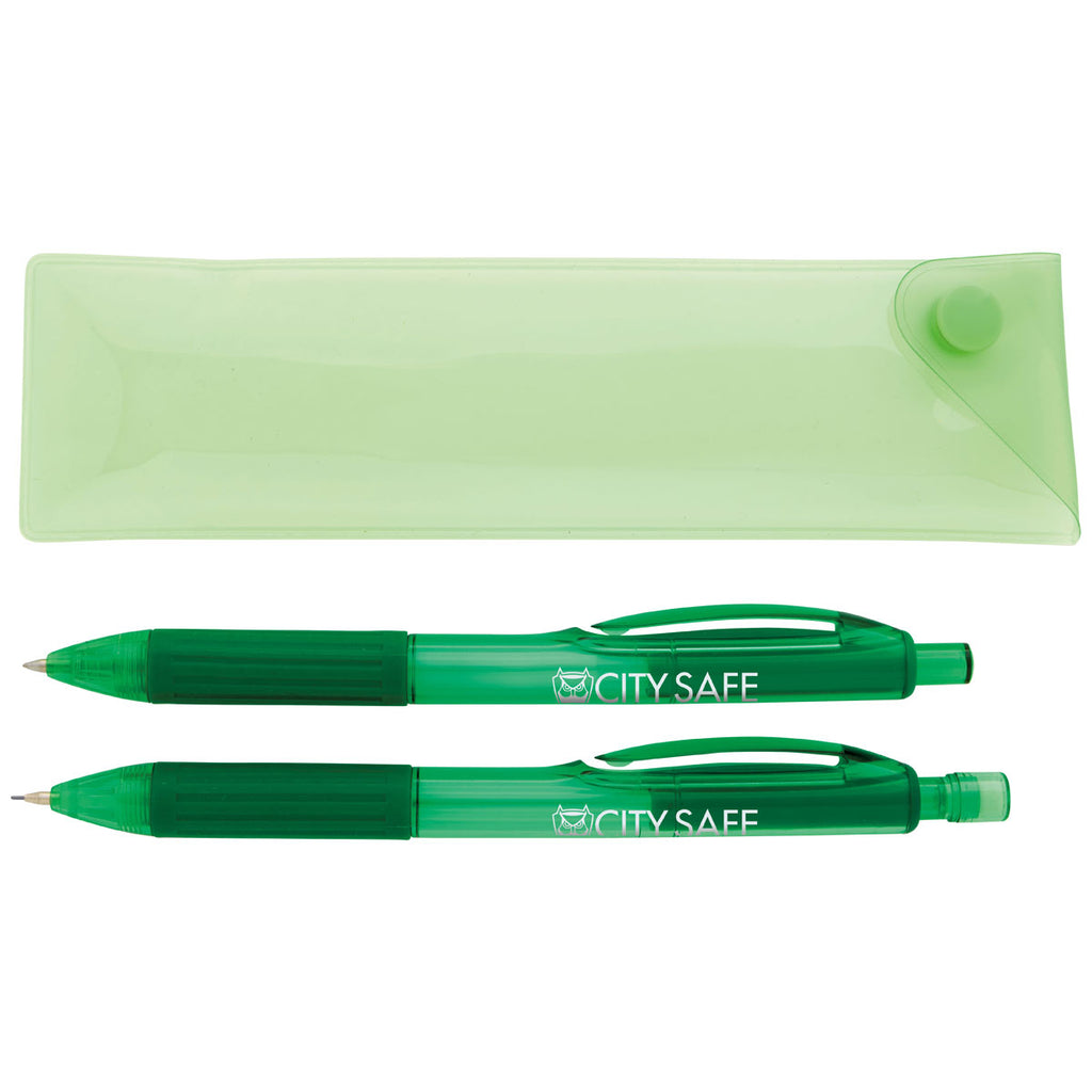 The Good Value Green Cliff Gel Pen and Mechanical Pencil Set with custom logo is the perfect cost effective gift for many occasions. Give to graduates, writers, those who draw, and college students as a gift or as an easy impulse purchase that is kept near the check out area. The plunger action gel pen and 0.5 mm lead mechanical pencil with built in eraser with cap comes in a matching see through pouch for easy carry and organization. Though a simple design, your company logo will stand out on the creative pen and pencil set as both will carry your brand. Place an order soon before these are out of stock.