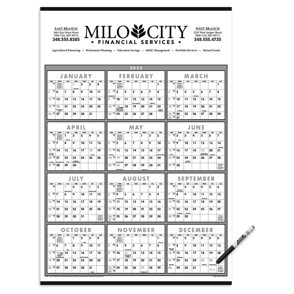 Add your logo to the Triumph Calendars Black & White Black & White Span-A-Year Laminated calendar so users see it daily when they check their schedule. This dry-erase type calendar allows you to easily add or erase appointments as needed. Each morning, check out the schedule and get moving. Perfect for home, work, or school. Order today.The minimum order for this product is 100 pieces.