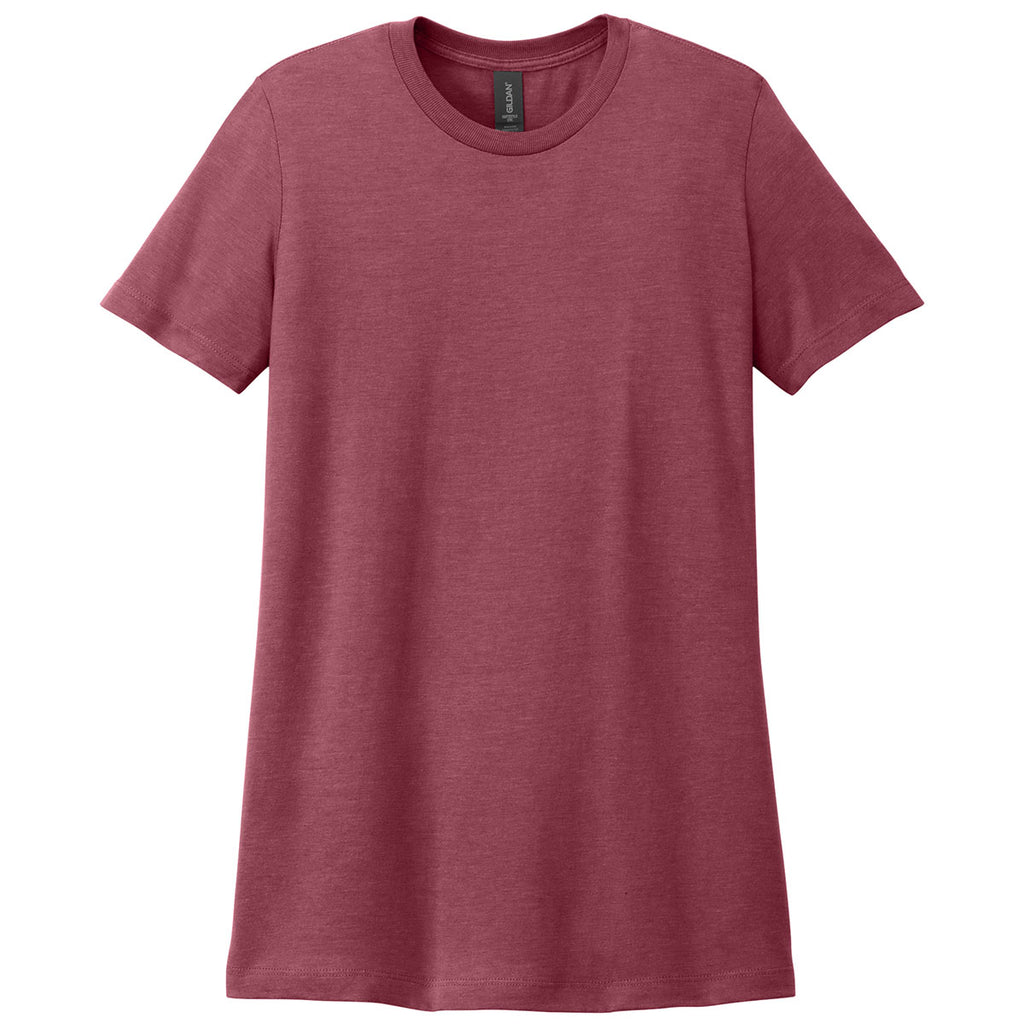 A simple silhouette and a flattering fit make the Gildan Women's Maroon Mist Softstyle CVC T-Shirt the perfect way for the ladies on your team to show off your company's custom logo or design. Ideal for athletes or anyone with an active lifestyle, it's made from a breathable fabric that will always keep your team comfortable.