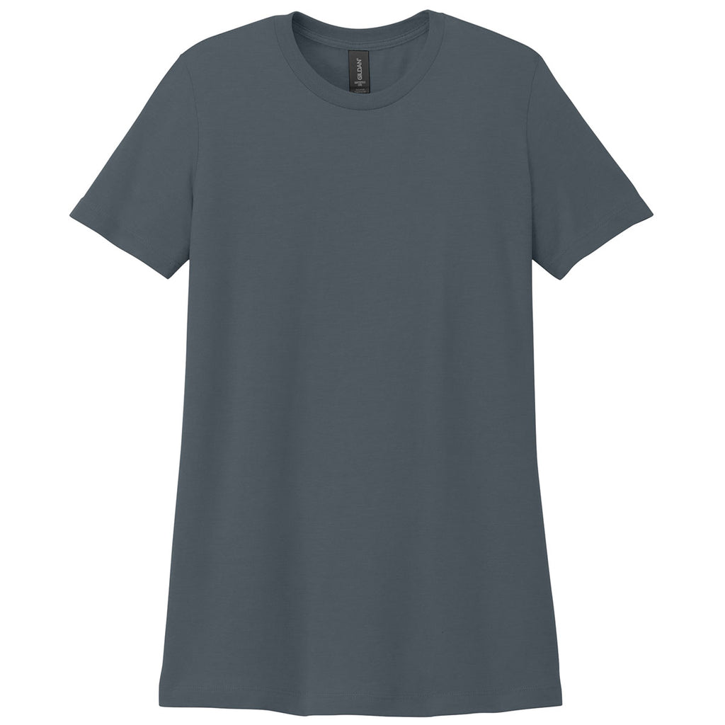 A simple silhouette and a flattering fit make the Gildan Women's Steel Blue Softstyle CVC T-Shirt the perfect way for the ladies on your team to show off your company's custom logo or design. Ideal for athletes or anyone with an active lifestyle, it's made from a breathable fabric that will always keep your team comfortable.