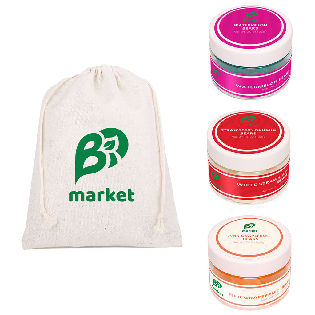SugarSpot Natural Goldilocks Sweetie Satchel with a custom logo is a fun summer-inspired treat bag that can be enjoyed alone or shared. The drawstring bag is filled with three separate fruit-flavored gummies in fun colors. Great to give as gift bags at a party, BBQ, or office event. Place your order today so you do not miss out.The minimum order for this product is 100 pieces.