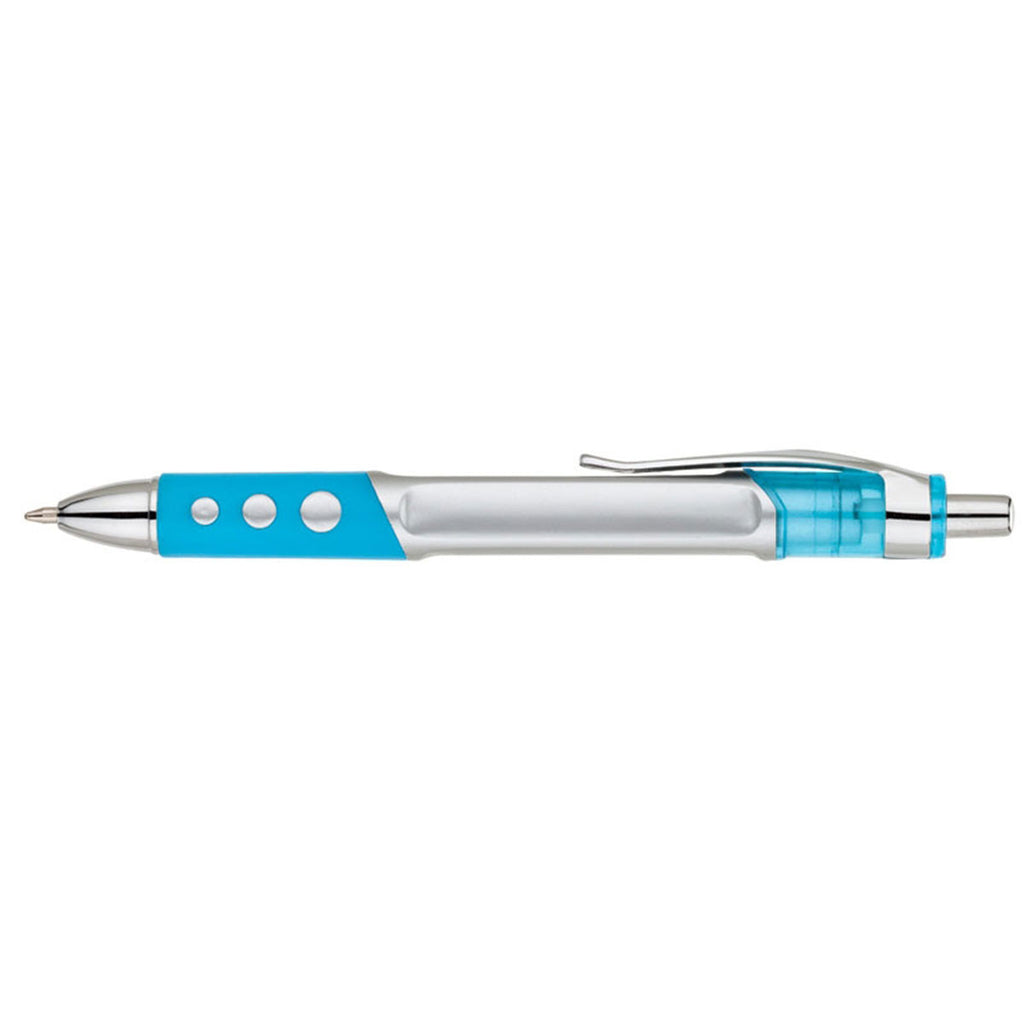 Pen down thoughts, ideas or a personal goal with this sleek push button Logomark Coleman Light Blue Ballpoint Pen that writes smooth and is gripped easily. Accentuated with chrome trims and silver body. This is pen is an affordable option when you need a huge quantity of promotional pens with your custom logo imprint.