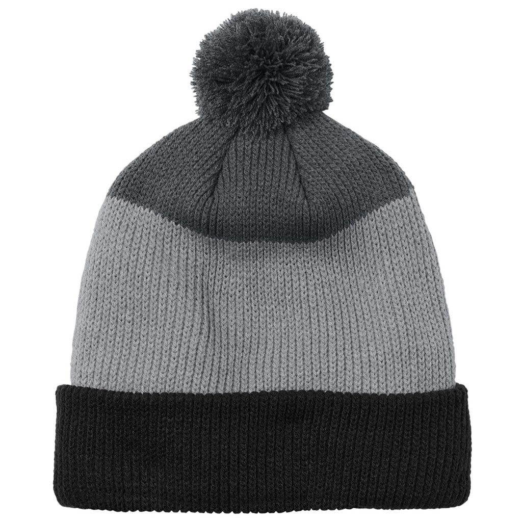 Port Authority Deep Black/ Gusty Grey/ Storm Grey Cozy Striped Pom Beanie