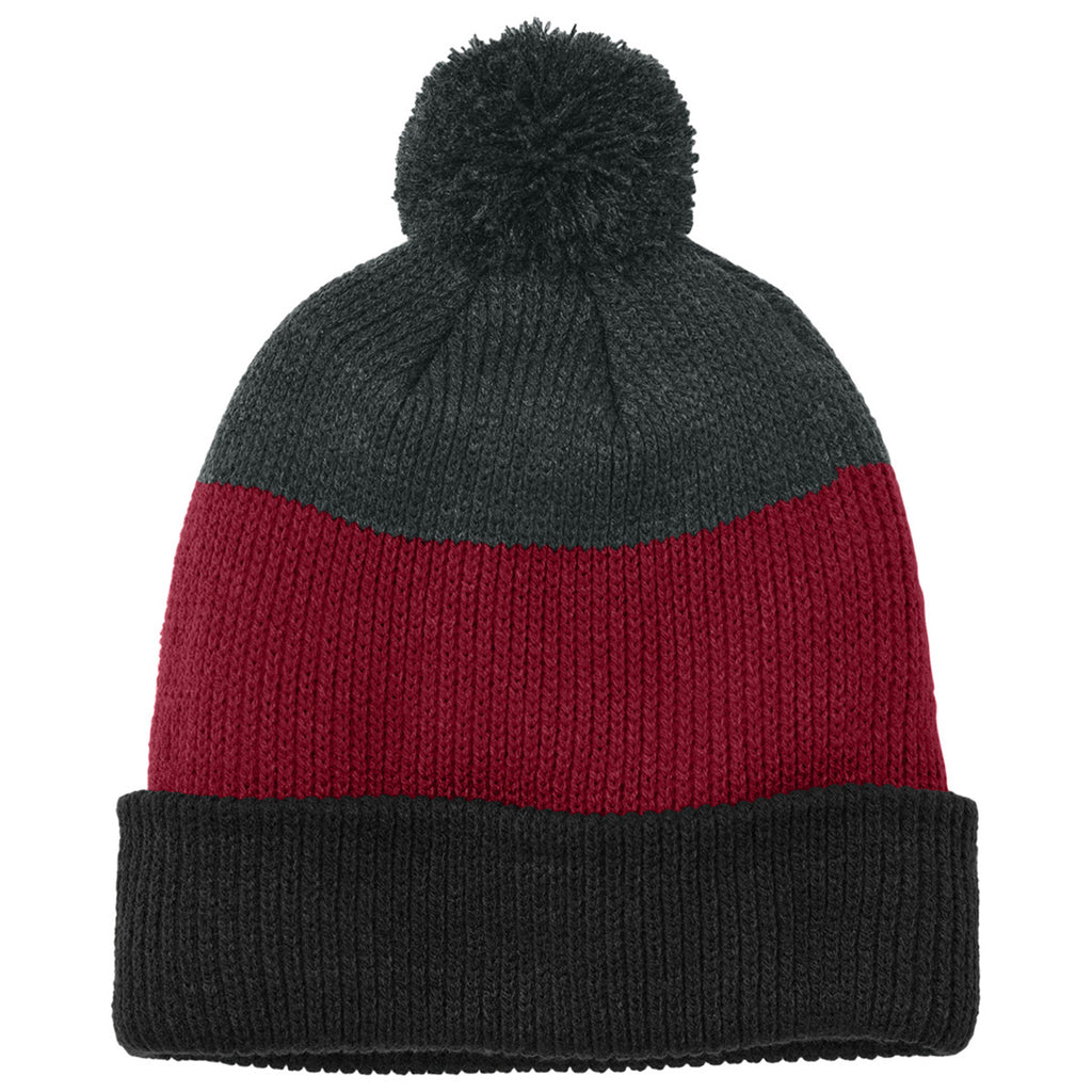 Port Authority Deep Black/ Rich Red/ Charcoal Heather Cozy Striped Pom Beanie