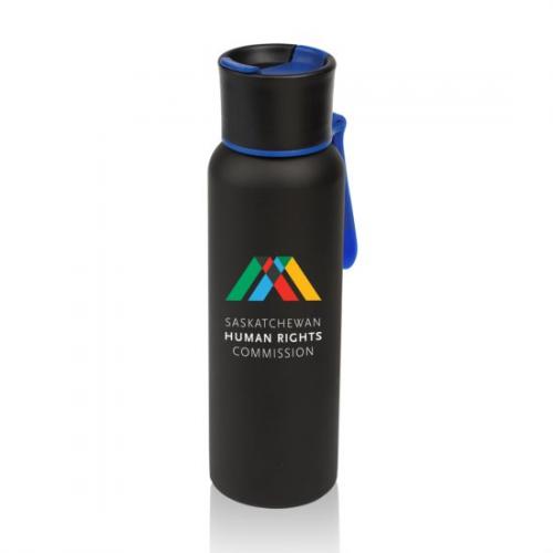 This K & R Royal Blue The Hurdler stainless steel water bottle was designed with the modern athlete in mind. Ensure everyone at the gym spots your custom logo by adding it to this bottle's matte black exterior. With an ice cube friendly opening, the color contrasting lid and silicone carry handle add the perfect design elements to this practical accessory.The minimum order for this product is 35 pieces.