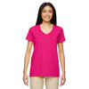 Thank the hard working women on your company team by giving away the screen printed Gildan Women's Black 5.3 oz. V-Neck T-Shirt. The one-half inch mitered v-neck collar presents a fashionable look that will turn heads crowded airport terminals and industry trade shows. With all eyes on the v-neck t-shirt, display the custom logo added on the durable fabric. Cap sleeves enhance comfort by providing more room to move both arms. Double needle stitching on the sleeves and bottom hem resists rips and tears to deliver years of high performance fashion use. The women's t-shirts work well as standalone apparel for active professionals.Highlights