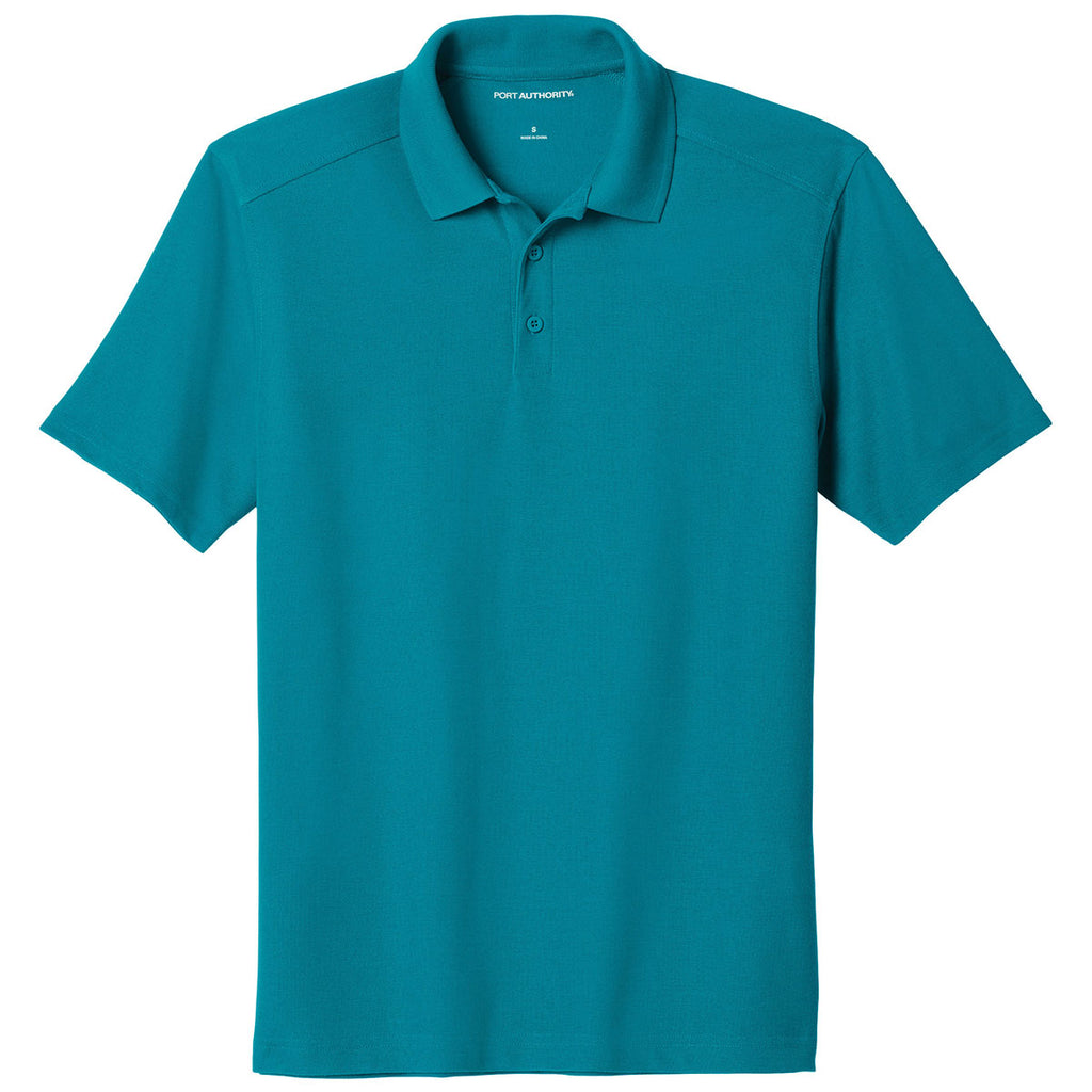 Paired with EZCotton polos, the custom logoed Port Authority Men's Teal EZPerformance Pique Polo raises the standard for employee apparel. Incredibly smooth 100% spun polyester pique remains in pristine condition for years to come. The flat knit collar presents a relaxed fit that will help your team settle into a professional networking event. Add your company logo on the large embroidery area to connect with other professionals at business conventions. With a logo, you put your best marketing foot forward to attract new customers for your business. Dyed-to-match buttons add a subtle chic touch for the pique polo.Corresponding Women's Style: Port Authority Women's Teal EZPerformance Pique Polo