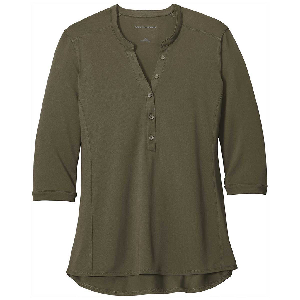 Enjoy a take on the classic henley style with the Port Authority Women's Deep Olive UV Choice Pique Henley in various size and color options. This gorgeous 2/3 length sleeve shirt is must have for the weekend warrior with a custom logo of your choosing. Perfect for team events or retreats, the soft polyester pique fabric is snag resistant, moisture wicking, and has a UPF rating of 20+. The open neckline on this 5 button henley makes it a great choice as a company uniform with a custom embroidery or simply a welcome addition to your personal wardrobe. Excellent prospect as an employee gift as well.Corresponding Men's Style: Port Authority Men's Deep Olive UV Choice Pique Polo