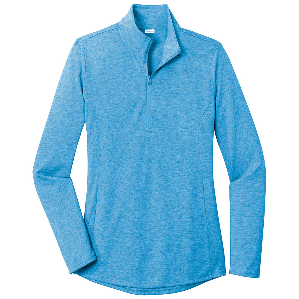 Order the embroidered Sport-Tek Women's Pond Blue Heather PosiCharge Tri-Blend Wicking 1/4-Zip Pullover as a gift for the women on your hard charging corporate team. Designed for year-round wear, the versatile pullover contains a blend of cotton, rayon, and polyester that deliver optimal comfort and durability. The subtly contoured silhouette will attract the attention of the professional peers your team members meet at business seminars. Take advantage of the attention by attaching your company logo on the pullover. Princess seams and cadet collar put the appearance of the athletic apparel on a higher fashion level than what is offered by the competition.Corresponding Men's Style:Sport-Tek Men's Pond Blue Heather PosiCharge Tri-Blend Wicking 1/4-Zip Pullover
