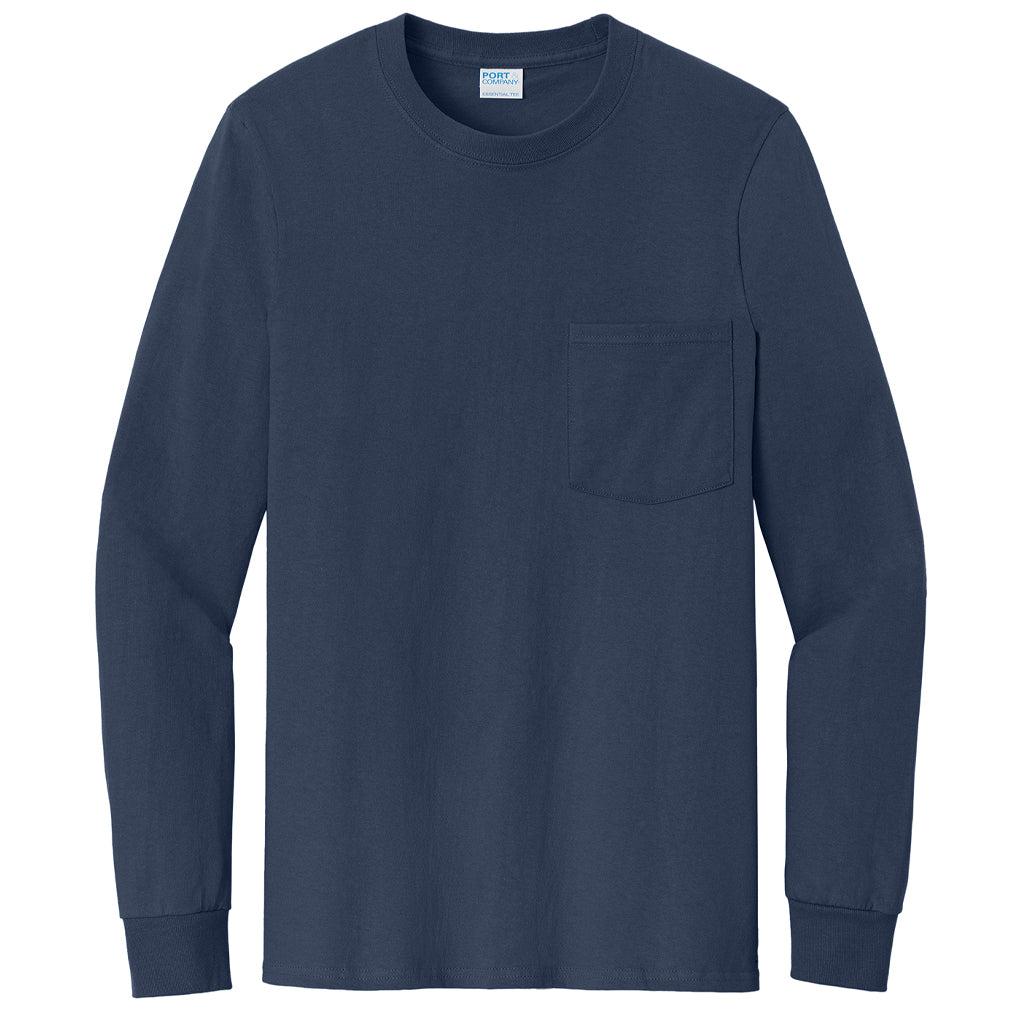 Keep it simple by adding your company's custom logo or design to the Port & Company Men's Navy Tall Long Sleeve Essential Pocket Tee. Great for audiences or employees of all kinds, this wearable long-sleeved tee is made from a comfortable, lightweight fabric and features a chest pocket for added convenience.Highlights