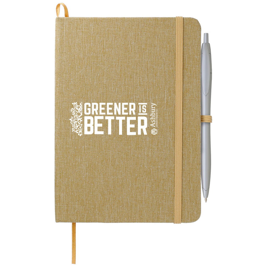 The Bullet Natural 5" x 7" Recycled Cotton Bound Notebook with custom logo is a hard bound, pre-consumer recycled cotton notebook with color matching elastic closure. The unique notebook is ready for notes at a meeting, trade show, or as you go through your day. Add a company logo to include in an employee welcome package or give out at trade shows to help your brand become recognizable. A ribbon page marker and pen loop mean all you need is easily accessible. Sheets of lined paper are included for convenience. Place an order today to use as you see fit.The minimum order for this product is 150 pieces.