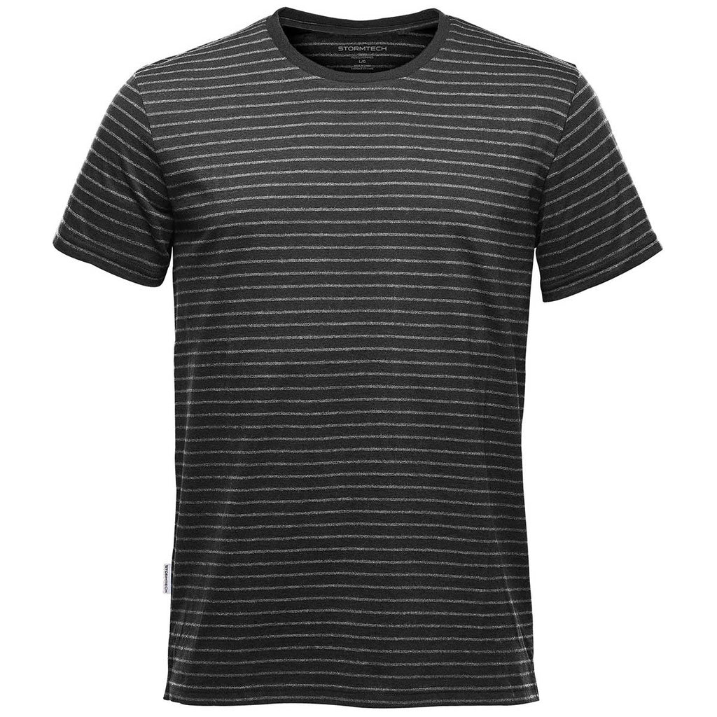Add a custom logo to the Stormtech Men's Black/Grey Heather Railtown Crew Neck Tee to create a comfortable, yet put together look that will stand out in a crowd. This striped tee is a staple for most wardrobes and can be customized with a company logo or design of your choosing. The versatile crew neck will look great whether enjoying a campfire, heading to work, or heading to a company outing. Subtle hem side slits offer breathability an UPF fabric ensures quality. Place an order today to use as employee apparel, gifts, or whatever else you may need.Highlights