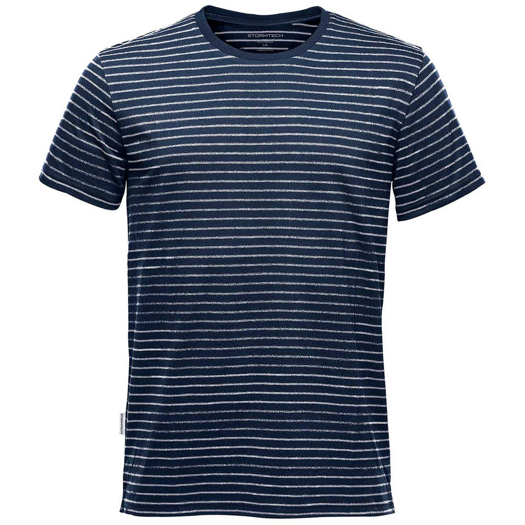 Add a custom logo to the Stormtech Men's Navy/White Railtown Crew Neck Tee to create a comfortable, yet put together look that will stand out in a crowd. This striped tee is a staple for most wardrobes and can be customized with a company logo or design of your choosing. The versatile crew neck will look great whether enjoying a campfire, heading to work, or heading to a company outing. Subtle hem side slits offer breathability an UPF fabric ensures quality. Place an order today to use as employee apparel, gifts, or whatever else you may need.Highlights