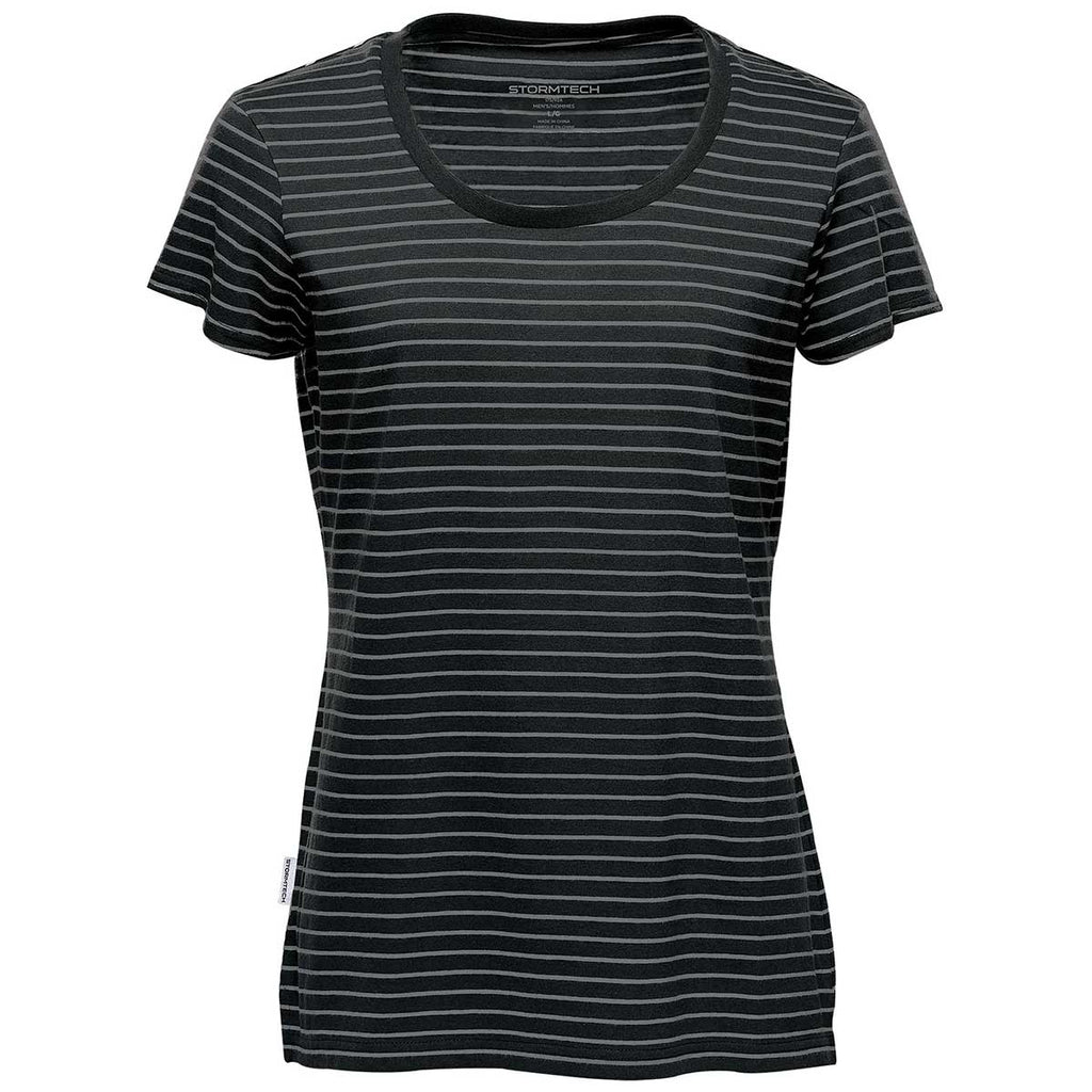 Stormtech Women's Black/Grey Heather Railtown Crew Neck Tee will display your custom screen print beautifully to make this closet staple a unique piece. Add a company logo to the striped crew neck tee for a versatile look that can be used as employee apparel or sold as an every day tee. Subtle hem slips keep the air flowing while the design helps you stand out in a crowd. Perfect for layering in cold weather or wearing alone when the sun is out, this tee is a must have.Highlights