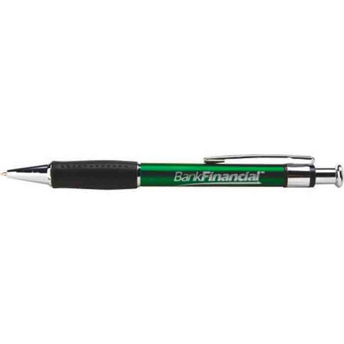 Dependable click action summons the durable tip of the Hub Pens Green Providence Pen to action every time you need to take notes. Silver accents on a wide barrel change the game for office supply design. Instead of using a drab writing instrument that inspires nothing more than yawns, you access an elegantly designed pen that everyone around you notices. Take advantage of the attention by attaching your corporate logo to the pen, with the goal of converting customer prospects into lifelong patrons of your business. The different ink options evenly apply to all types of writing surfaces.