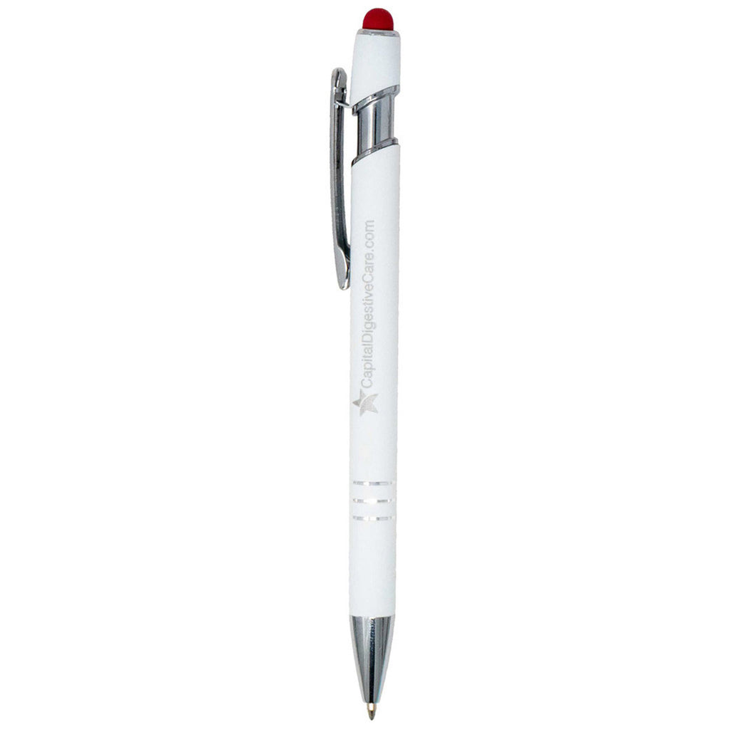 Hub Pens Red Textari Comfort Cloud Stylus Pen with a corporate design will leave you on cloud nine. This rubberized pure white metal barrel with colorful stylus tips combines writing comfort and stylus functionality. Ideal for those who are always on the go, this pen can be shared with recruits, traveling agents, and work-from-home employees. Order today.The minimum order for this product is 100 pieces.