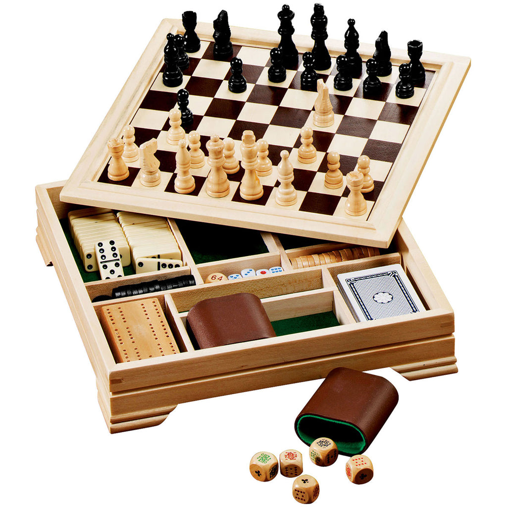 - Includes game pieces for checkers, chess and backgammon, 28 dominoes, cribbage board and pegs, a standard deck of cards, four dice, and an instruction booklet