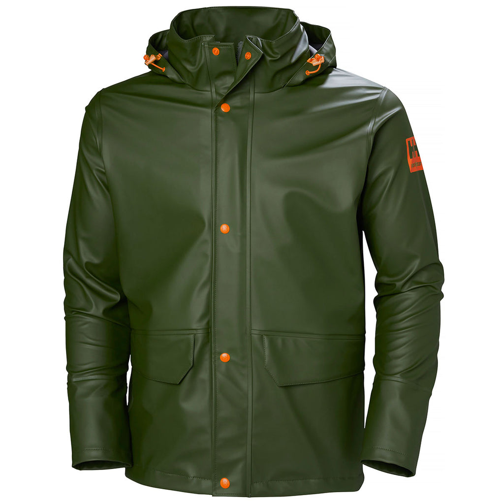 Looking for corporate rainwear? Look no further than the Helly Hansen Men's Army Green Gale Rain Jacket embroidered with your company's custom logo or brand name. Its 4-Way stretch construction offers a full range of motion while waterproof fabric and construction sheds rain for dry comfort. Moisture-wicking knit makes for optimal breathability on outdoor endeavors. Its double Storm flap shields you from the elements while multiple pockets protect electronics. Help your group look sharp while outsmarting Mother Nature with the minimalist design of this customizable outerwear that packs some powerful features: a packable hood for easy packing, neoprene cuffs keep moisture at bay, and an extended back for enhanced comfort.
