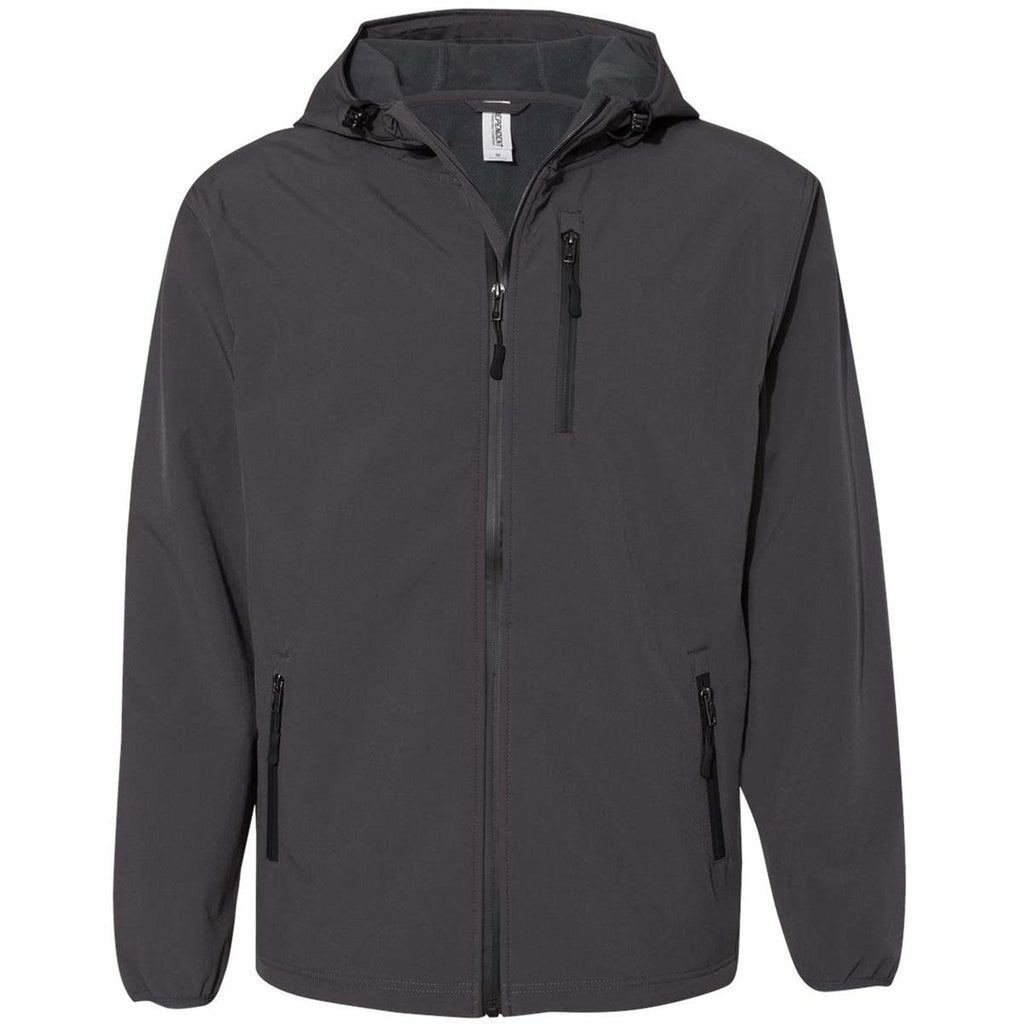 A custom Independent Trading Co. Men's Graphite Poly-Tech Soft Shell Jacket is the perfect employee gift idea for every occasion. Created from 100% polyester shell bonded to micro fleece with a waterproof coating up to 20,000 mm, this soft shell jacket is comfortable and fashionable. The 3 panel scuba hood with toggles makes this jacket perfect when the weather turns for the worse. Add a corporate embroidery that showcases your company logo and use these as part of employee apparel for delivery drivers, at trade shows, or big events. Plenty of pockets including chest, welt, and media pockets make this highly functional.Highlights