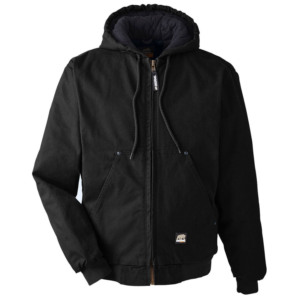 Be ready for anything with a custom embroidery Berne Men's Black Highland Washed Cotton Duck Hooded Jacket. This heavyweight, quilt lined super duty cotton duck jacket is a must have for those who work and play outdoors no matter the weather. Add a company logo for those who make deliveries, work on a farm, or spend long periods of time outdoors. A custom logo creates an overall look for all who need a jacket to keep up with their hard work. A triple stitched main seam, heavy duty brass zipper, insulated hood, and pleated elbows create a durable piece with functional front patch pockets and inside pockets as needed.Highlights
