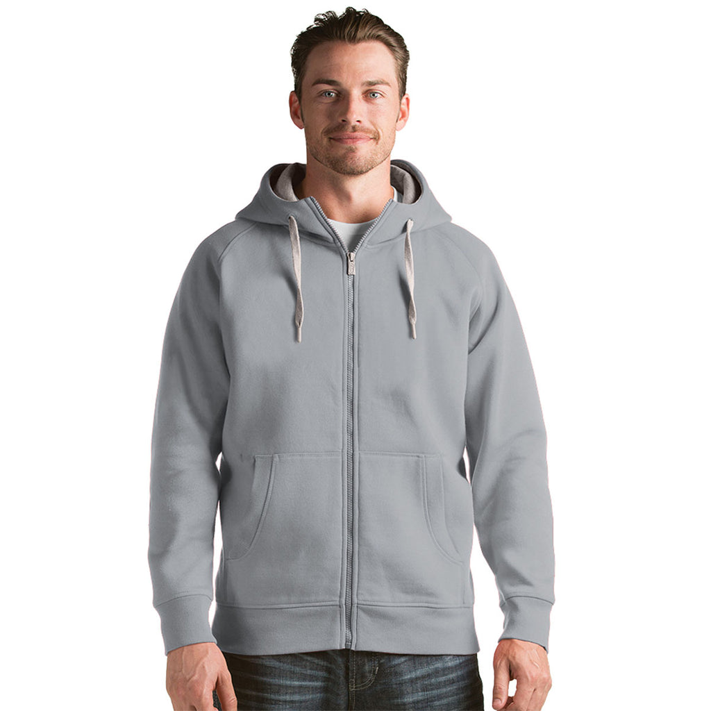 The custom Antigua Men's Grey Heather Victory Full Zip Hoodie is the perfect companion for your company logo. Super soft cotton blends with highly durable polyester to create the ideal outer layer for both camping trips and golf tournaments. Not to mention a great layering piece for a long day of business travel. Cover stitching at the rib cuff and bottom hem adds a stylish design element to the hoodie. Attach a custom logo on the large imprint area to increase your brand awareness at industry events and recruiting outings. Your team will be more than happy to wear this comfortable full zip during the work week and on the weekends.Corresponding Women's Style: Antigua Women's Grey Heather Victory Hoodie