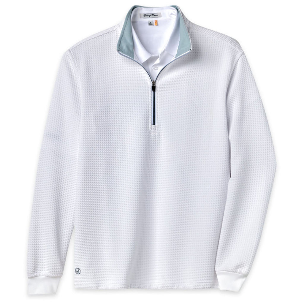 Designed for corporate branding or upscale casual wear, the Straight Down Men's White Optic Quarter Zip stands out with its textured jacquard pattern. The breathable fabric stretches for comfort while providing a tailored look. Easy to layer over polos or tees, it's a go-to piece for team events or travel.Highlights
