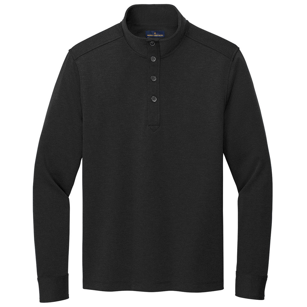 Design a custom embroidery for the Brooks Brothers Men's Black Heather Mid-Layer Stretch Half Zip for a look that will take you places. The double-knit style is luxuriously soft and forgoes the typical half-zip style for a buttoned vent with a cadet collar. Rounded button cuffs that can be worn long or rolled up. Add a company logo to use as employee gifts or simply enjoy as everyday attire. Order today.