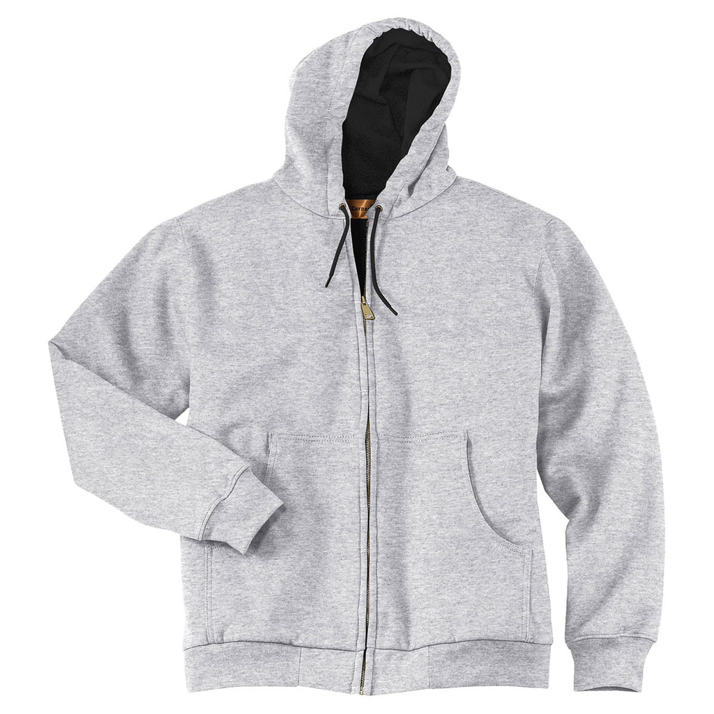 The scientific assertion that we lose most of our body heat through our heads might be an old wives tail. Yet, think about how you feel on the construction site during a frigid, blustery day sans a thick hat. The CornerStone Men's Athletic Heather Heavyweight Full-Zip Hooded Sweatshirt with Thermal Lining goes a hat one better by providing covering for you head, as well as your neck and upper shoulders. Thermal nylon-polyester lining inside of the hood and sweatshirt traps body heat to act as a natural heater. The construction workwear sweatshirt comprises 100% lightweight, odor resistant cotton-polyester that stretches on the job, but it never breaks.Highlights