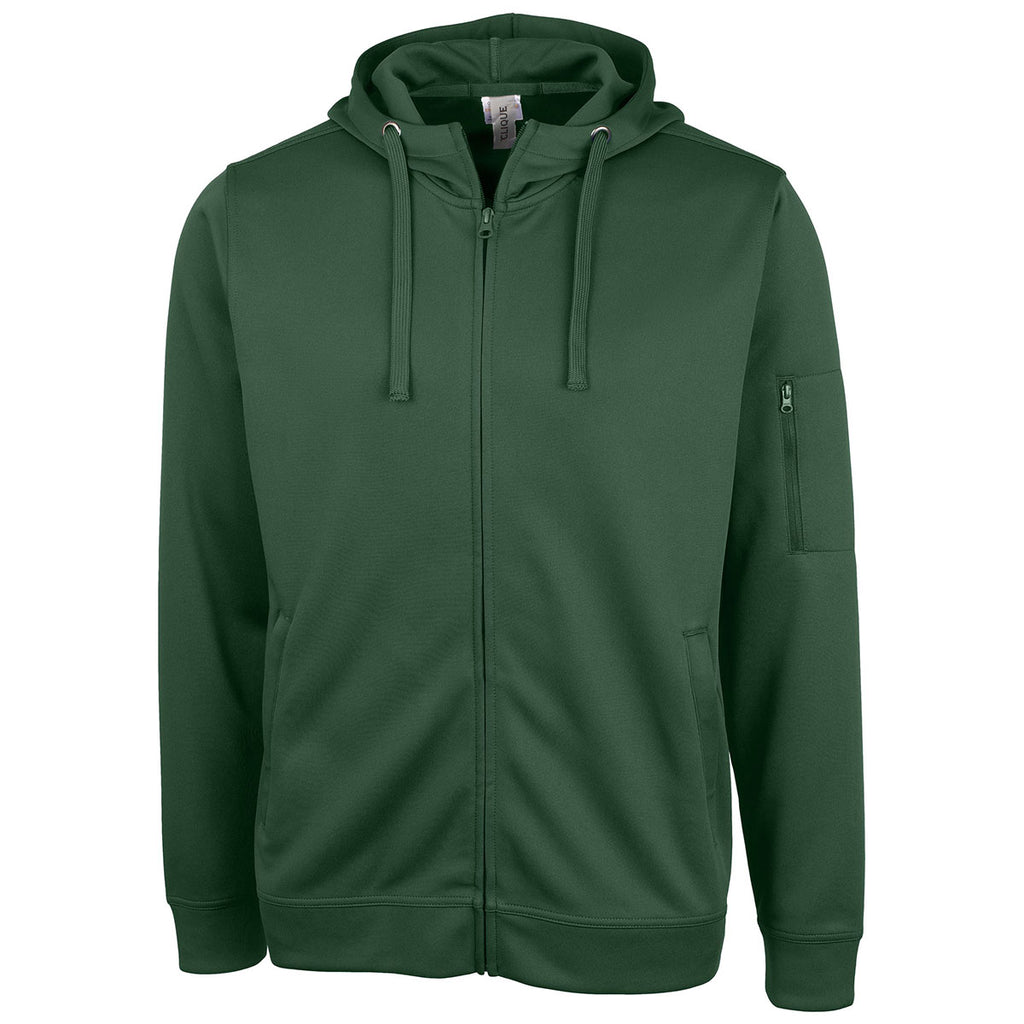 The Clique Men's Bottle Green Lift Performance Full Zip Hoodie is the perfect sweatshirt to throw on quickly when you want to be comfortable after a long, hard day at the office. A custom logo can be added to the front which provides an easy way to advertise your company name. Choose from classic colors and enjoy fabulous product features including 100% polyester interlock fabric, attached hood with drawstrings, full zip closure, welt pockets, zip pocket on sleeve, and self-fabric banded hem and cuff. Purchase a few of these must-have hoodies as employee apparel and hand them out to the top earners at your company. In fact, why not give everyone a company hoodie.Highlights