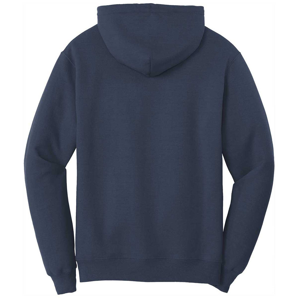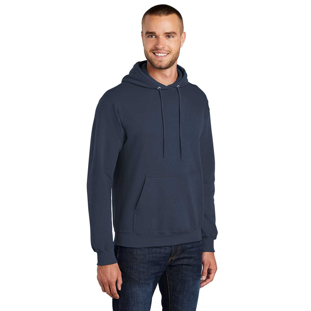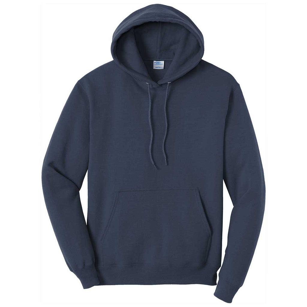 Enjoy total comfort in a custom Port & Company Men's Navy Tall Core Fleece Pullover Hoodie with heat transfer of your choice. Made of a cozy 50/50 cotton/poly fleece material with air jet yarn for a pill-resistant finish, this hoodie is a must have addition for most activities. Add a custom logo to use as team gear for team events or a company logo for use as employee gifts that will be worn often. The fabric lined hood with drawstrings, tear away label, and front pouch pocket create a look that is comfortable and convenient. The additional length is ideal for those who are taller but still desire coverage.Highlights