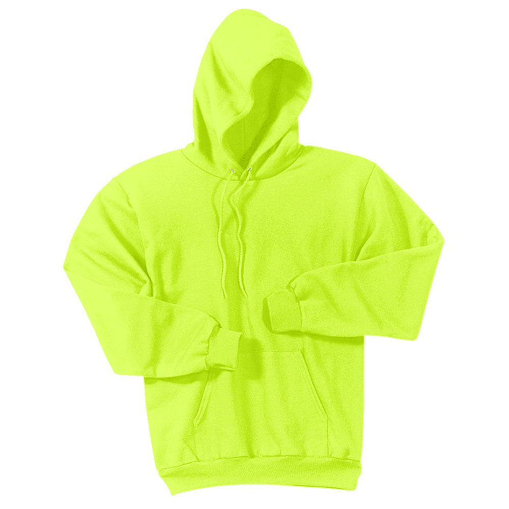 The time has come to relax after a long day at work and no other recreational apparel allows you to kick back with more style than the custom logoed Port & Company Men's Safety Green Tall Essential Fleece Pullover Hooded Sweatshirt. Designed with a two-ply hood, the sweatshirt is the ultimate outerwear to take along on camping trips and outdoor adventures. The air jet yarn produces a soft, pill-resistant finish to ensure you remain comfortable throughout the day. Highly durable polyester combines with smooth cotton to withstand the punishment delivered by your active lifestyle. Attach your company logo to increase recognition of your brand at business conferences.Highlights