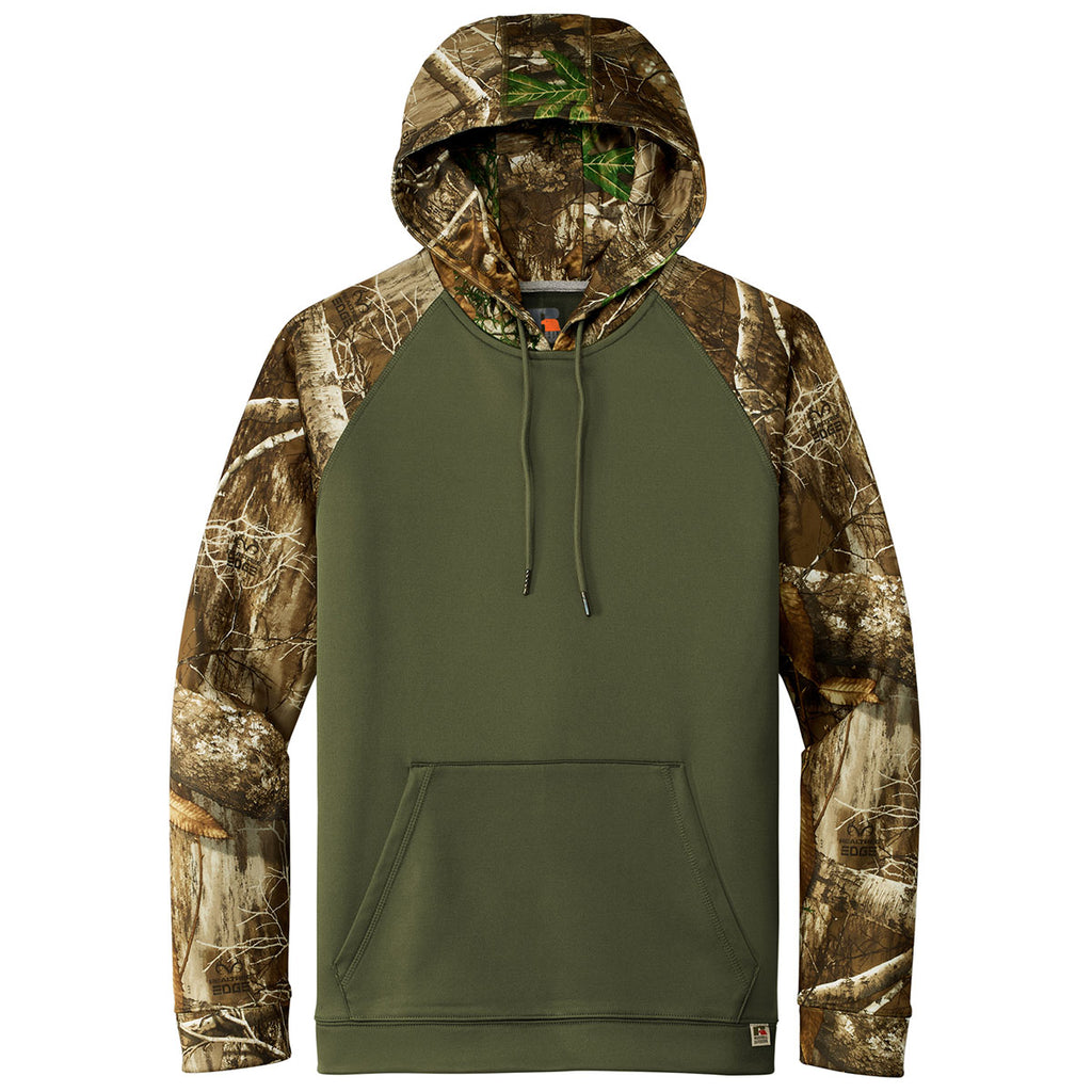 Adding your company's custom logo or design to the Russell Outdoors Men's Olive Drab Green/ Realtree Edge Realtree Performance Colorblock Pullover Hoodie will allow your team or customers to represent your brand wherever they go. This comfortable pull-over comes complete with a camouflage pattern, making it perfect for anyone who loves spending time in the great outdoors.