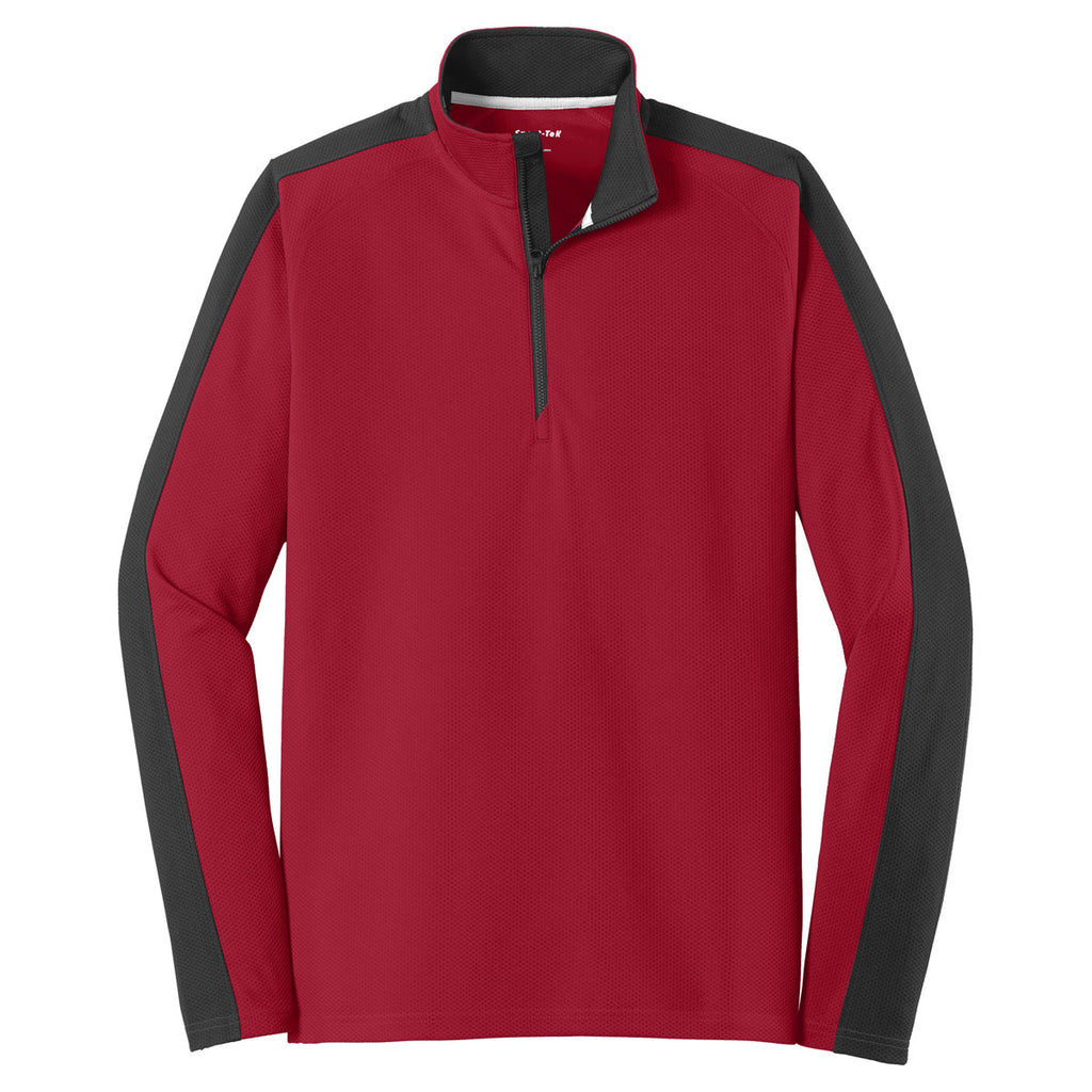When you want to make a fashion statement at work or after work hours during a night on the town, you can't go wrong by wearing the Sport-Tek Men's Deep Red/Black Sport-Wick Textured Colorblock 1/4-Zip Pullover. Designed with 100% polyester, the pullover quickly removes perspiration to cool the skin. The stylish cadet collar works in fashion harmony with the taped neck to present a dignified, yet casual appearance. Contrast stripe raglan sleeves give the pullover a sporty look. The large imprint area on the pullover makes the perfect spot to add a custom logo that promotes your company.Highlights