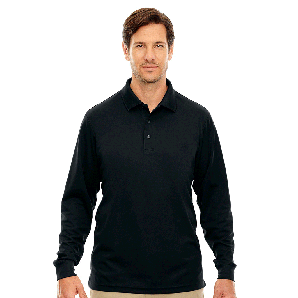 Give the Core 365 Men's Black Tall Pinnacle Performance Long-Sleeve Pique Polo as the ultimate corporate gift to your loyal customers and dedicated employees. The versatile long sleeve polo makes a professional fashion statement in the workplace and a sleek fashion statement during a night on the town. Moisture wicking technology quickly removes the perspiration that builds up because of you dancing the night away. Rugged 100% polyester never rips and tears to give you a go to shirt for all occasions. The matching flat knit collar adds a unique style element to a polo that exudes panache.Highlights